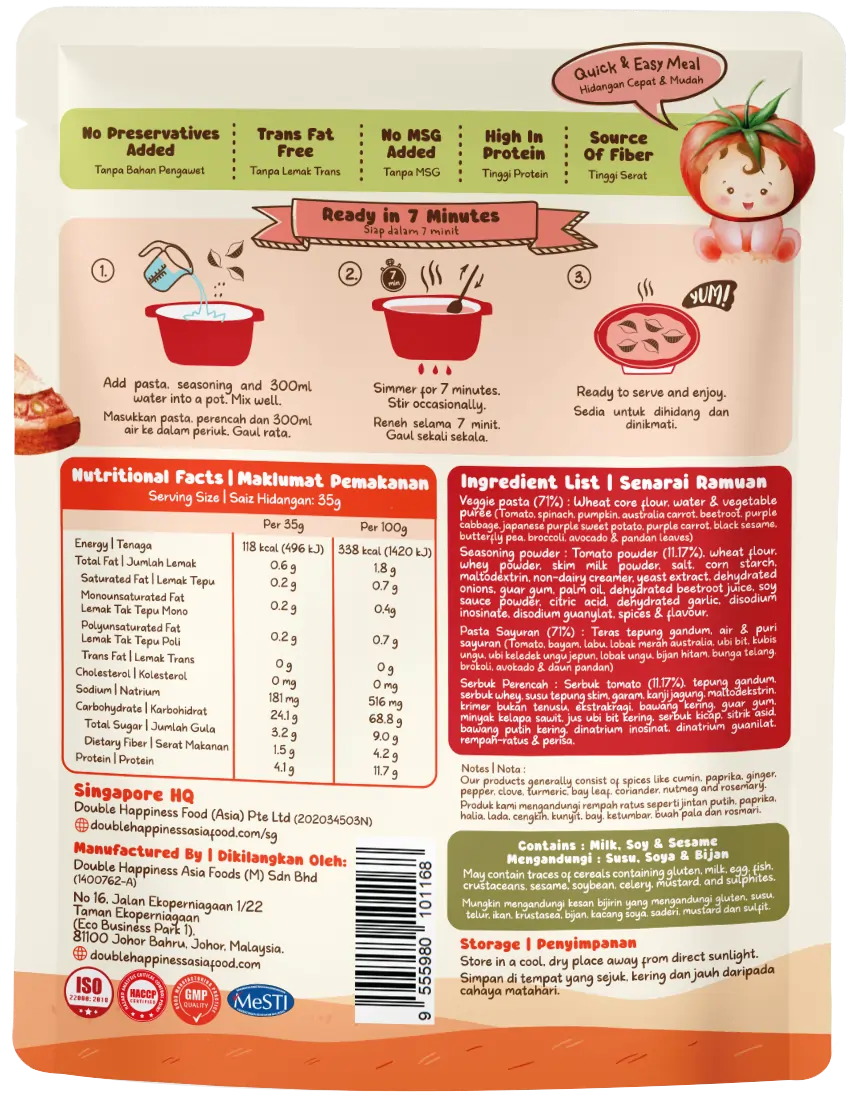 Ingredients | Veggie pasta (71%): Wheat core flour, water & vegetable puree (Tomato, spinach, pumpkin, australia carrot, beetroot, purple cabbage, japanese purple sweet potato, purple carrot, black sesame, butterfly pea, broccoli, avocado & pandan leaves). Seasoning powder: Tomato powder (11.17%), wheat flour, whey powder, skim milk powder, salt, corn starch, maltodextrin, non-dairy creamer, yeast extract, dehydrated onions, guar gum, palm oil, dehydrated beetroot juice, soy sauce powder, citric acid, dehydrated garlic, disodium inosinate, disodium guanylat, spices & flavour. |