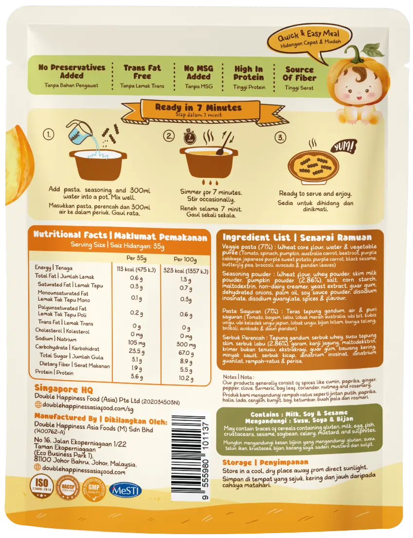 Ingredients | Veggie pasta (71%): Wheat core flour, water & vegetable puree (Tomato, spinach, pumpkin, australia carrot, beetroot, purple cabbage, japanese purple sweet potato, purple carrot, black sesame, butterfly pea, broccoli, avocado & pandan leaves). Seasoning powder: Wheat flour, whey powder, skim milk powder, pumpkin powder (2.86%), salt, corn starch, maltodextrin, non-dairy creamer, yeast extract, guar gum, dehydrated onions, palm oil, soy sauce powder, disodium inosinate, disodium guanylate, spices & flavour. |