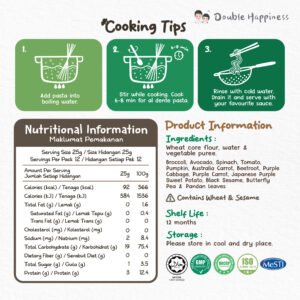 Kaedah Memasak & Masa:Api: Rebus dalam air selama 6-8 minit dan toskan. Bekas Makanan / Termos: Letakkan dalam air mendidih selama 6-8 minit dan toskan. Mikrowave: Tambahkan air panas dan masak dalam mikrowave selama 6-8 minit, kemudian toskan.