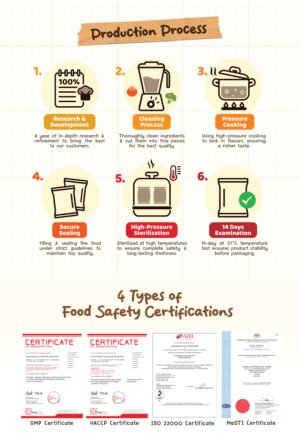 Bubur kami tidak mengandungi garam atau bahan tiruan tambahan. Kami menggunakan sup masakan rumah dan bukannya air, memastikan kemanisan semula jadi dalam setiap suapan. Dibungkus dalam pek yang mudah dibawa, setiap satunya mengandungi sudu yang tersendiri, menjadikannya sempurna untuk memberi makan di mana-mana sahaja. Hanya buka dan sedia dimakan, atau panaskan dengan meletakkan pek dalam air panas selama 3-5 minit.