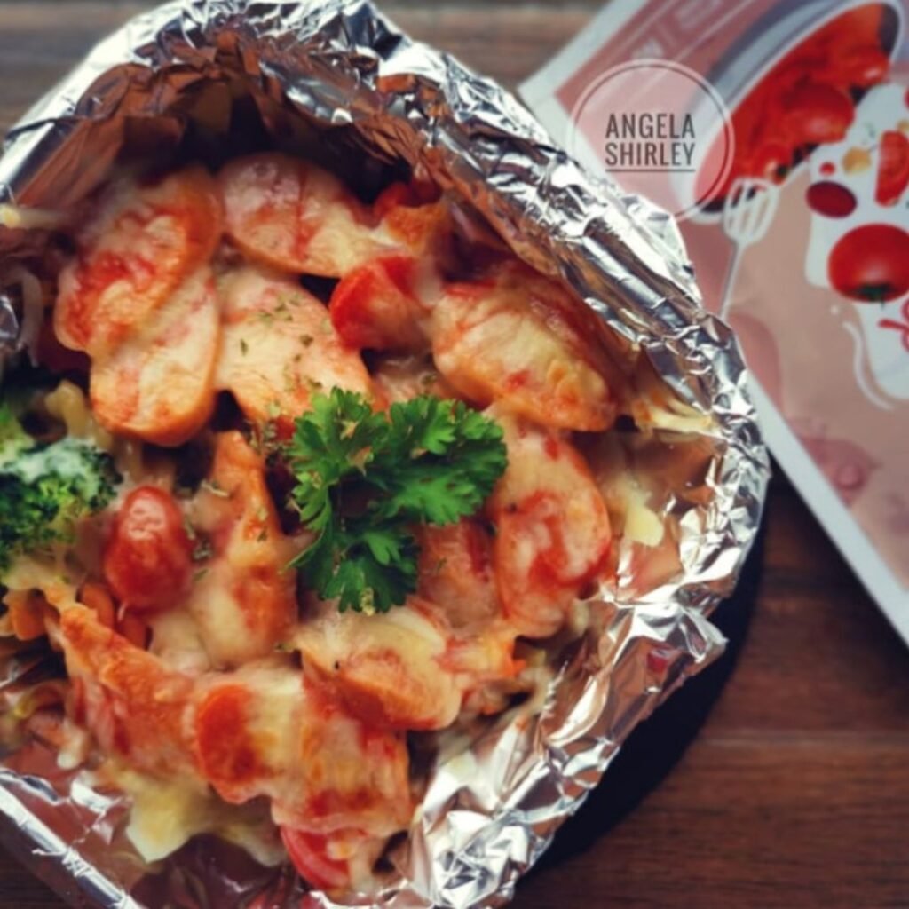 - Sapukan bahan-bahan di atas kertas foil dan taburkan dengan sos merah dan keju.