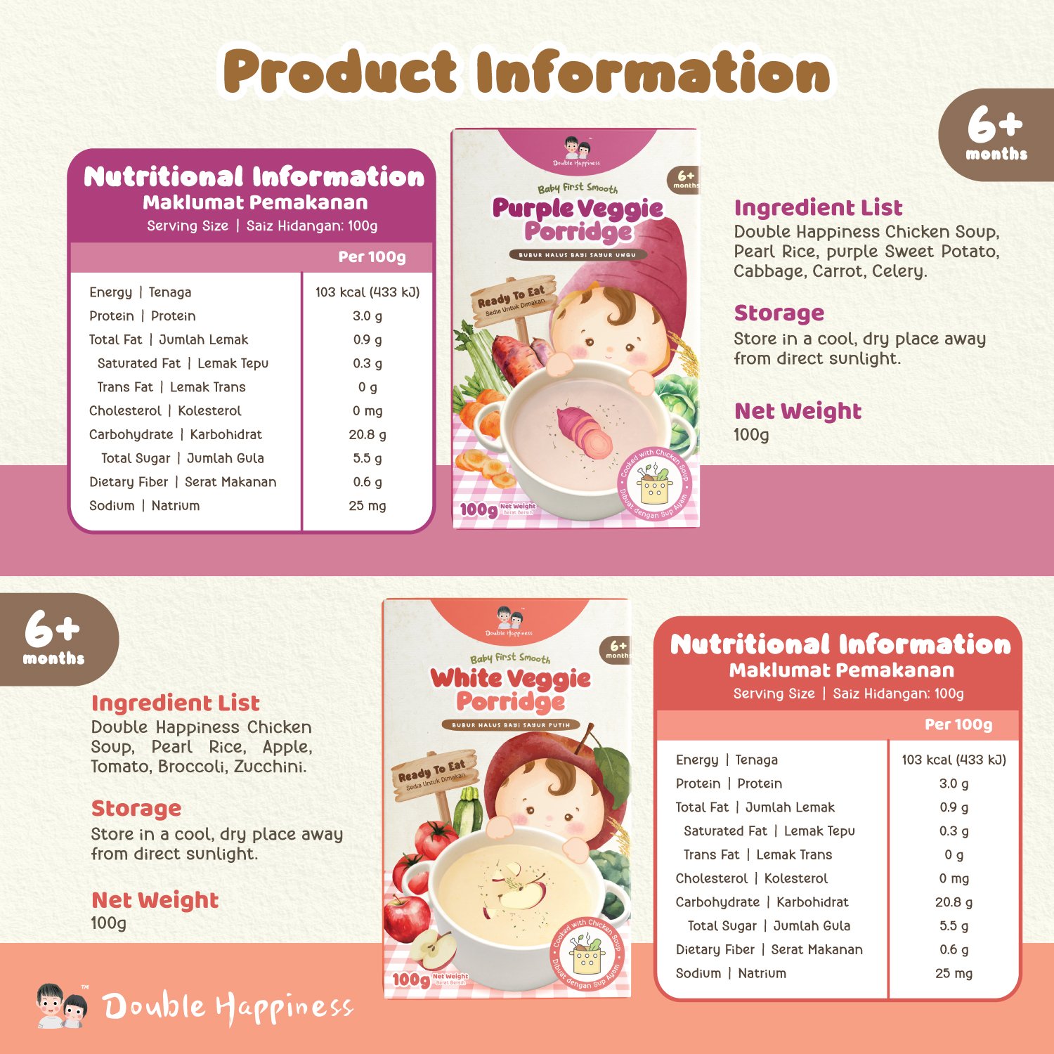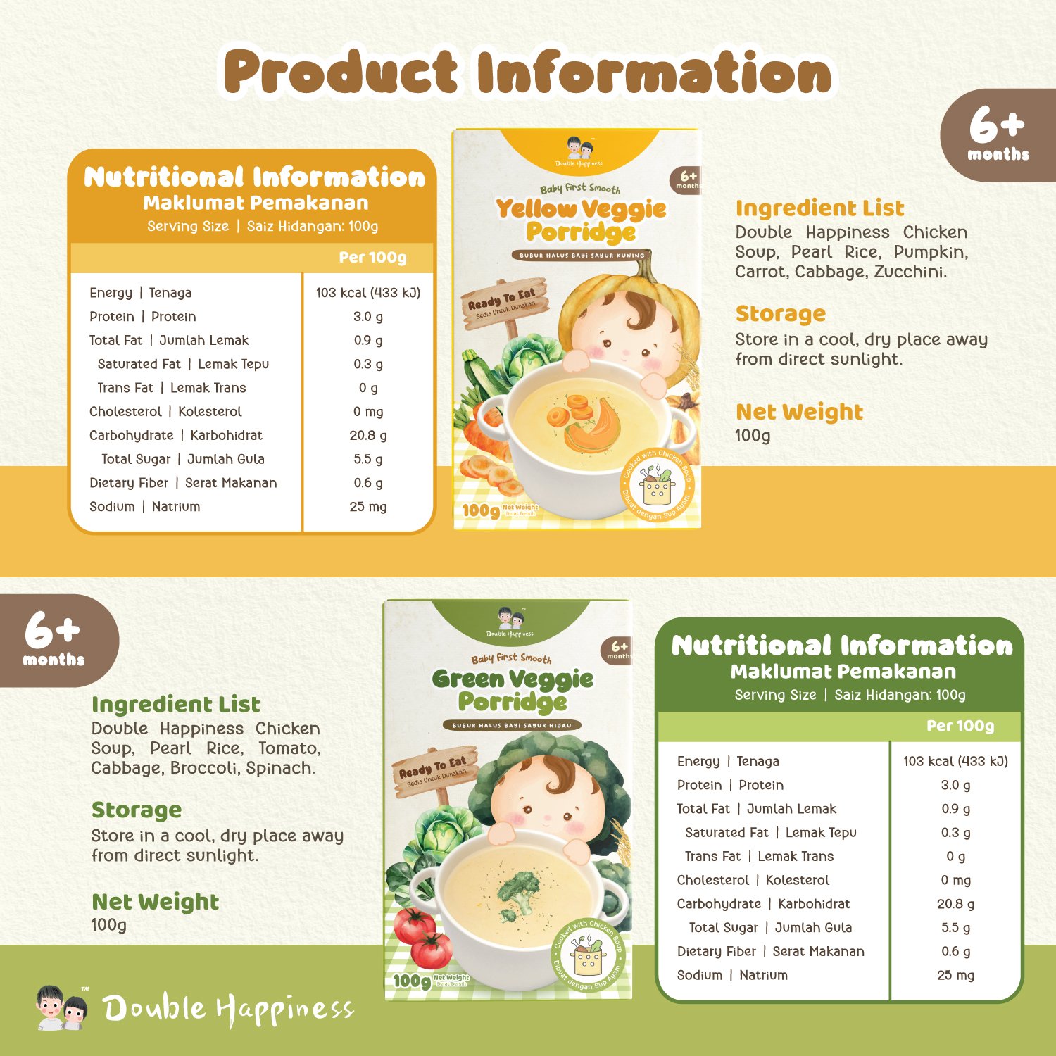 Our porridge is made with homemade soup instead of water, bringing natural sweetness and rich flavor in every spoonful. Packaged in convenient, travel-friendly pouches with their own spoon, they’re perfect for feeding on-the-go. Simply open and serve, or warm up by placing the pouch in hot water for 3-5 minutes.
